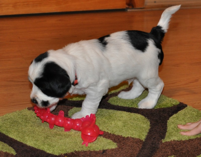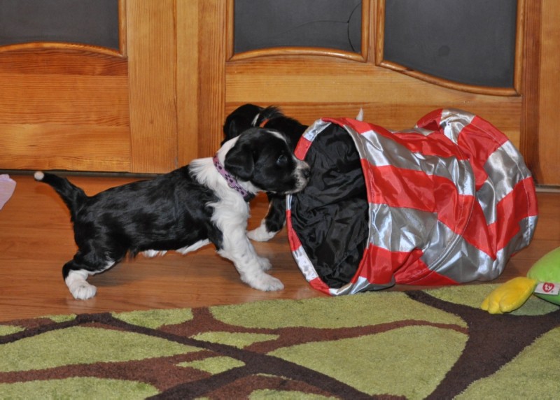 Długo nic nie pisałam i nie zamieszczałam zdjęć naszych słodziaków...i wcale nie dlatego, że nic się nie działo, a wręcz przeciwnie...to były pracowite dni i dla nas i dla maleństw...szczególnie dla nich - chipowanie, szczepienie - zapewne te dwie rzeczy były najmniej przyjemne. Pierwsza jazda samochodem okazała się nie przysparzać żadnych problemów - a światła samochodów budziły ogromne zainteresowanie. Podobnie było z pierwszą kąpielą :-) zamiast czuć się chociaż dla przyzwoitości troszkę w wannie przestraszone to one broiły jak najęte - próbowały łapać wodę , gryźć pianę nawet gąbka nie była bezpieczna :-) . Gdy tylko pogoda poprawiła się nieco i temperatura podniosła powyżej zera rozpoczęły się też pierwsze spacery...najpierw nie podobało się zupełnie, nim ostatni skarb "wyszedł" na dwór to ten pierwszy już domagał się powrotu...trochę byłam tym  zdziwiona...Gdy na kolejny spacer wyszły z nowofundlandką zmiana w zachowaniu była radykalna - hm czyżby tylko pod moją opieką nie czuły się bezpieczne ;-) Tak czy inaczej w tej chwili potrafią "wołać" na spacer po 5 razy na dzień i nie ukrywam, że ustepuję im szybciutko - rwetes jaki podnoszą jest okrutny :-)...