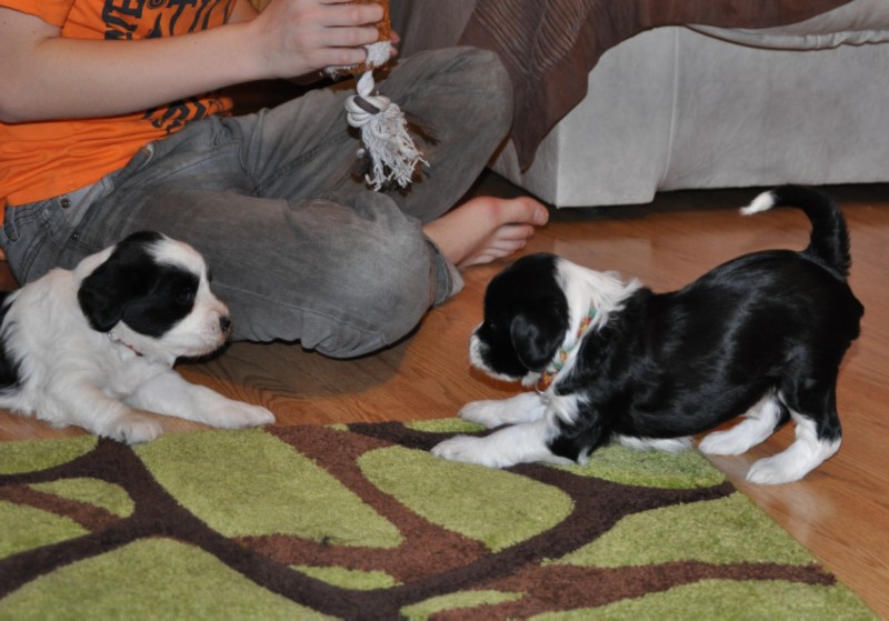 Długo nic nie pisałam i nie zamieszczałam zdjęć naszych słodziaków...i wcale nie dlatego, że nic się nie działo, a wręcz przeciwnie...to były pracowite dni i dla nas i dla maleństw...szczególnie dla nich - chipowanie, szczepienie - zapewne te dwie rzeczy były najmniej przyjemne. Pierwsza jazda samochodem okazała się nie przysparzać żadnych problemów - a światła samochodów budziły ogromne zainteresowanie. Podobnie było z pierwszą kąpielą :-) zamiast czuć się chociaż dla przyzwoitości troszkę w wannie przestraszone to one broiły jak najęte - próbowały łapać wodę , gryźć pianę nawet gąbka nie była bezpieczna :-) . Gdy tylko pogoda poprawiła się nieco i temperatura podniosła powyżej zera rozpoczęły się też pierwsze spacery...najpierw nie podobało się zupełnie, nim ostatni skarb "wyszedł" na dwór to ten pierwszy już domagał się powrotu...trochę byłam tym  zdziwiona...Gdy na kolejny spacer wyszły z nowofundlandką zmiana w zachowaniu była radykalna - hm czyżby tylko pod moją opieką nie czuły się bezpieczne ;-) Tak czy inaczej w tej chwili potrafią "wołać" na spacer po 5 razy na dzień i nie ukrywam, że ustepuję im szybciutko - rwetes jaki podnoszą jest okrutny :-)...