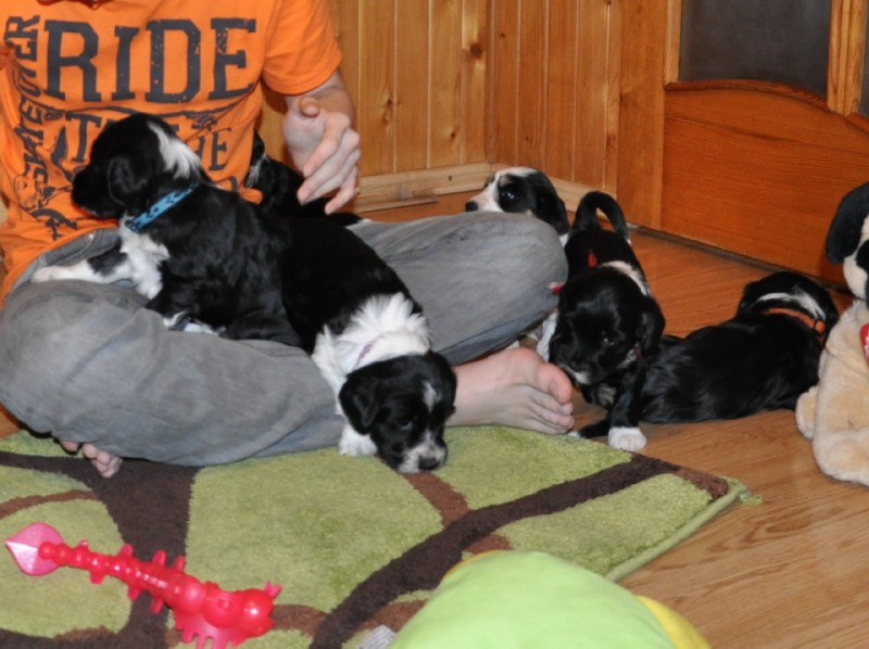Długo nic nie pisałam i nie zamieszczałam zdjęć naszych słodziaków...i wcale nie dlatego, że nic się nie działo, a wręcz przeciwnie...to były pracowite dni i dla nas i dla maleństw...szczególnie dla nich - chipowanie, szczepienie - zapewne te dwie rzeczy były najmniej przyjemne. Pierwsza jazda samochodem okazała się nie przysparzać żadnych problemów - a światła samochodów budziły ogromne zainteresowanie. Podobnie było z pierwszą kąpielą :-) zamiast czuć się chociaż dla przyzwoitości troszkę w wannie przestraszone to one broiły jak najęte - próbowały łapać wodę , gryźć pianę nawet gąbka nie była bezpieczna :-) . Gdy tylko pogoda poprawiła się nieco i temperatura podniosła powyżej zera rozpoczęły się też pierwsze spacery...najpierw nie podobało się zupełnie, nim ostatni skarb "wyszedł" na dwór to ten pierwszy już domagał się powrotu...trochę byłam tym  zdziwiona...Gdy na kolejny spacer wyszły z nowofundlandką zmiana w zachowaniu była radykalna - hm czyżby tylko pod moją opieką nie czuły się bezpieczne ;-) Tak czy inaczej w tej chwili potrafią "wołać" na spacer po 5 razy na dzień i nie ukrywam, że ustepuję im szybciutko - rwetes jaki podnoszą jest okrutny :-)...